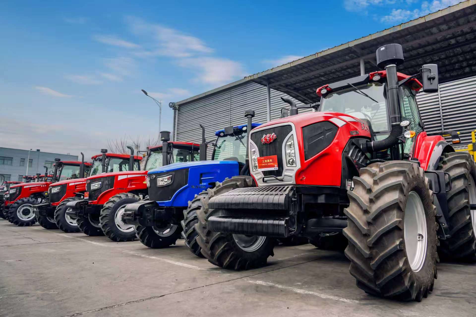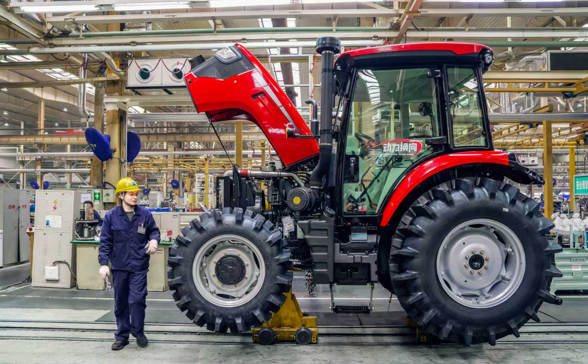 全程无需司机操做,到智能化大马力农机,车间内只要零散几个工人正在一旁巡检照看。一排排陈列的产物,